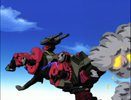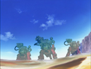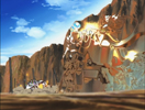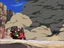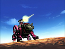 Soon they encountered problems with Team Blitz was able to locate them using the detection capabilities of their Dibison. Stealth wasn't Team Gold's only option, however. They also employed a large ball that served as a battering ram to take out the team's Dibison, and even with a single Zoid left to take on, they brought out their backup: A Saber Tiger with a Missile Diffusion System. Unfortunately, gun shots from the enemy team's Command Wolf disrupted their stealth shields, and dust gathering on the battlefield highlighted the location of the other cloaked Zoid.