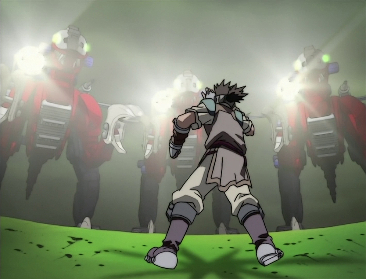 These Rev Raptors surrounded Bang's group, suspecting them of destroying an Imperial Army Redlers that'd actually been shot down by the Geno Saurer. Raven's Organoid, Shadow, swooped in and kidnapped the crowned prince right in the middle of the chaos. Bang took off after him while Moonbay and Irvine battled the Rev Raptors to buy him some time.
