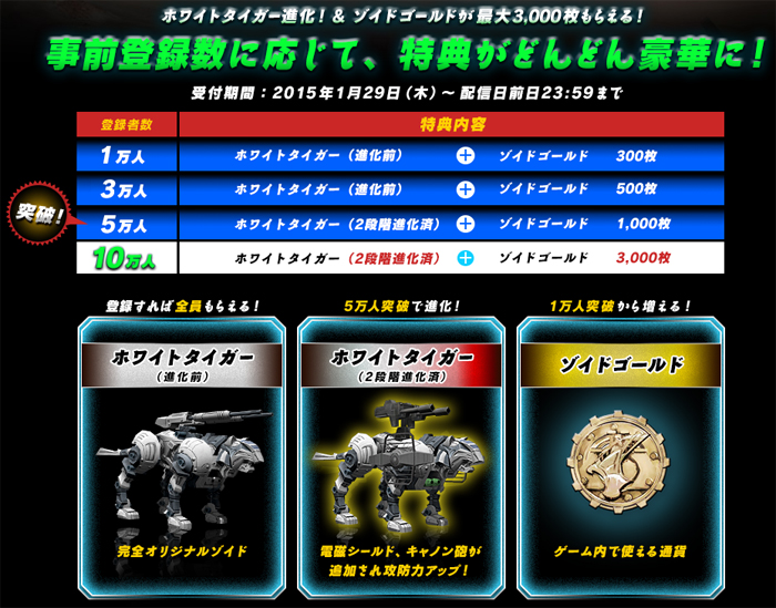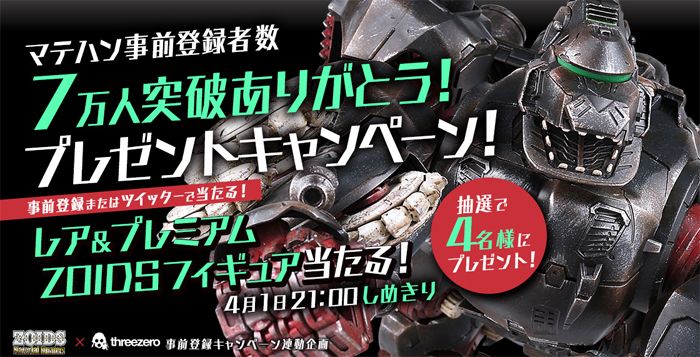 This campeign is for a give-away of threezero products, which feature Zoids relevant to the Material Hunters universe. In celebration of reaching 70,000 registrants G-Cluster will be holding a free raffle for 3 threezero Iron Kongs and 1 threezero Shield Liger.
