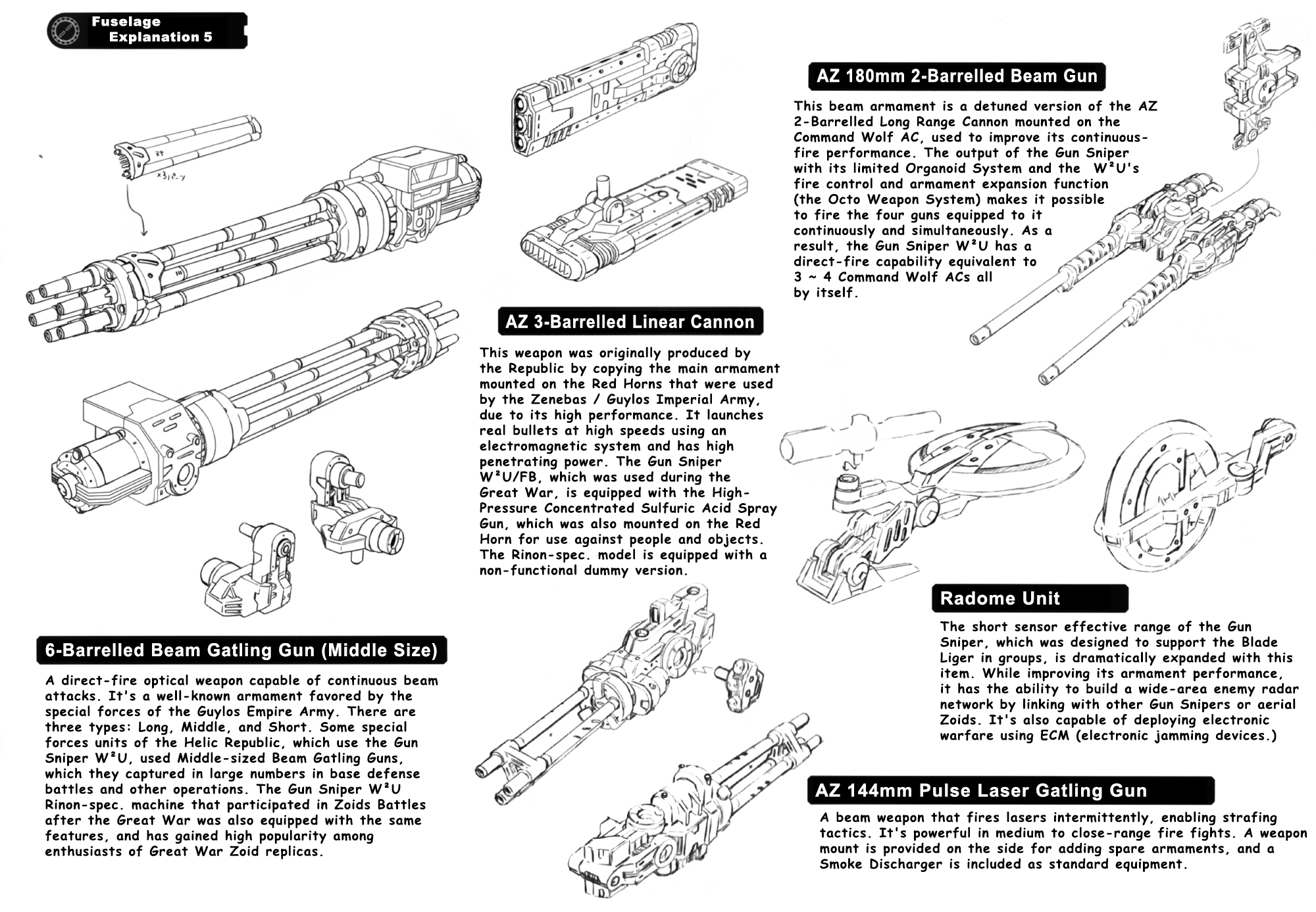 A Gun Sniper variant equipped with maximum firepower, said to have been used by certain special forces in the Helic Republic Army during the Central Continent War. By making the most of its Octo Weapon System, the weapon extension function of the Wild Weasel Unit (W2U), which was developed as dedicated additional equipment, it was able to be equipped with 4 2-Step 8-Shot Missile Pods, which were additional armaments made by the Republican Army, as well as 2 6-Barrelled Beam Gatling Guns (Mid-Sized) and 2 Anti-Zoid 3-Barrelled Linear Cannons, which were armaments captured from the Guylos Empire Army. All of this in addition to the W2U's standard weaponry, the 2 AZ 144mm Pulse Laser Gatling Guns and 4 AZ 180mm 2-Barrelled Beam Guns. Its main body was also given a reinforcing tune-up, focused on the body frame and leg joints, in order to hold this overloaded equipment. With this, we've succeeded in giving the small-scale Zoid Gun Sniper firepower superior to a medium-scale Zoid. But although this machine could be called a "running armory", it has poor operability, so it was a special mission Zoid used only by a handful of excellent Zoid pilots and depending on the strategic situation.
