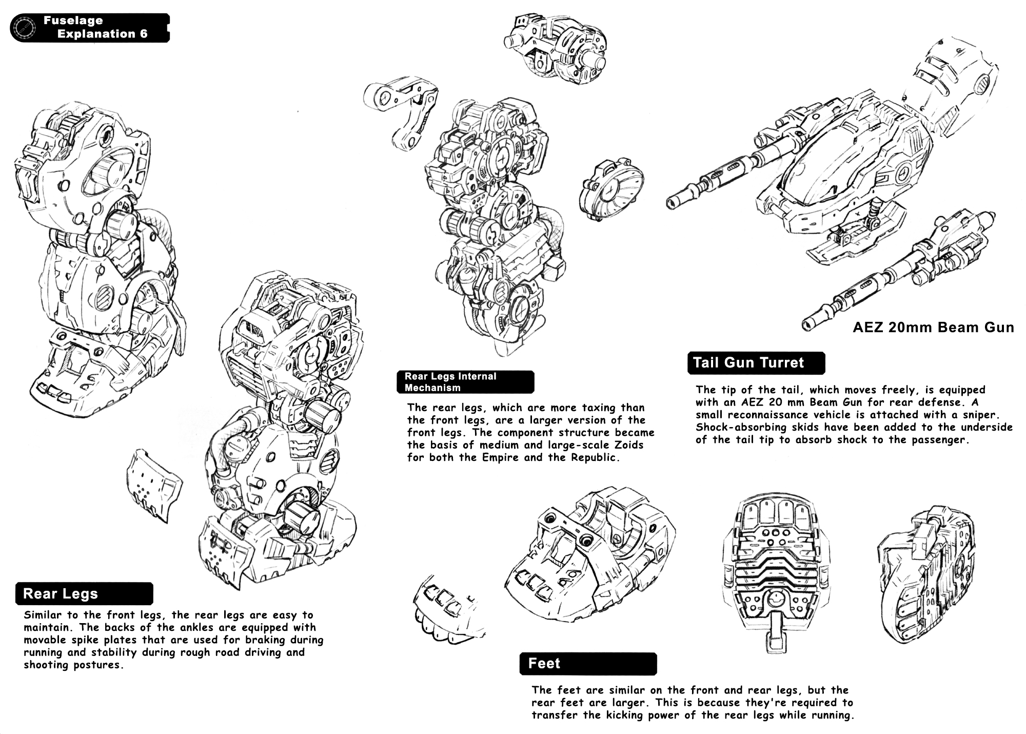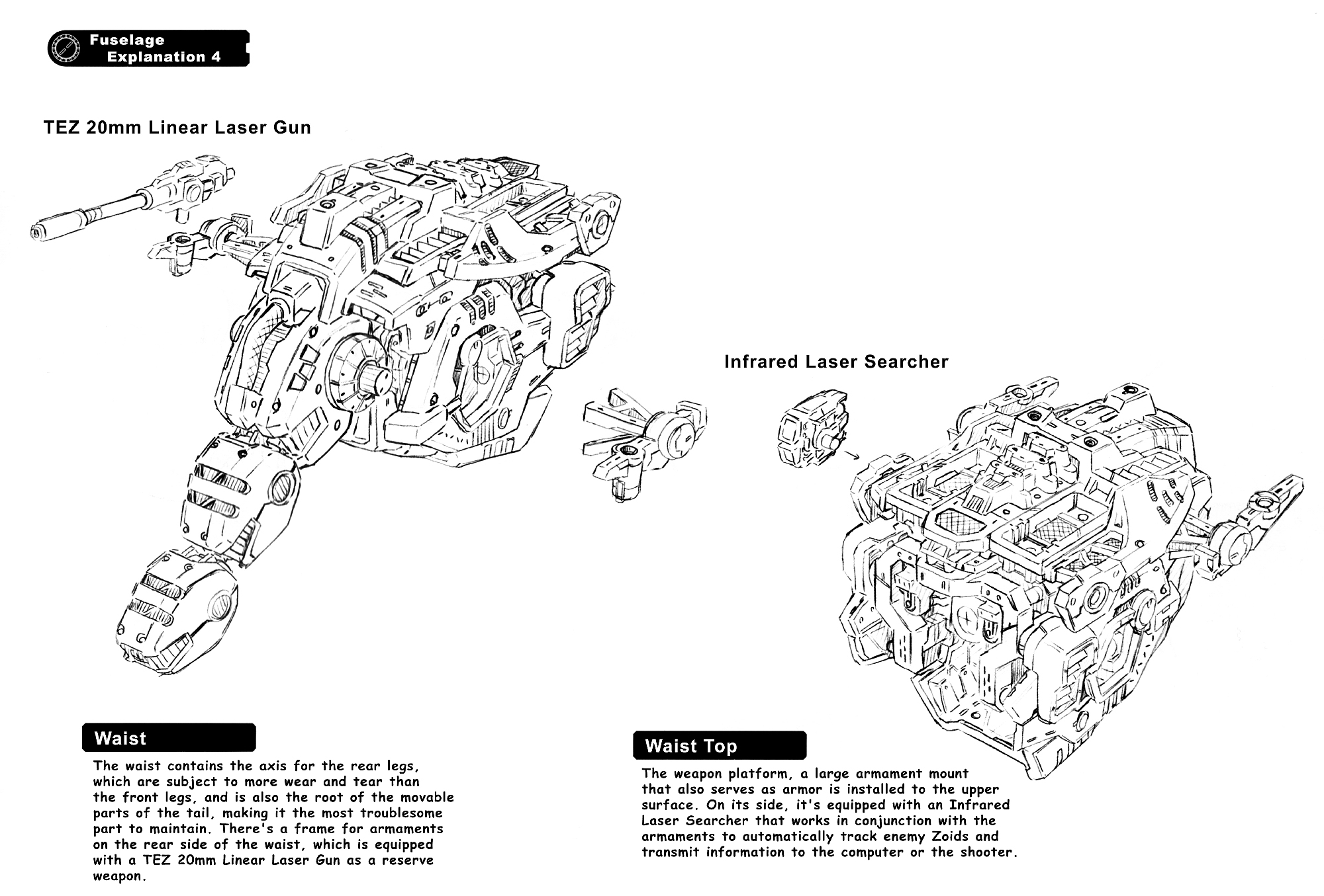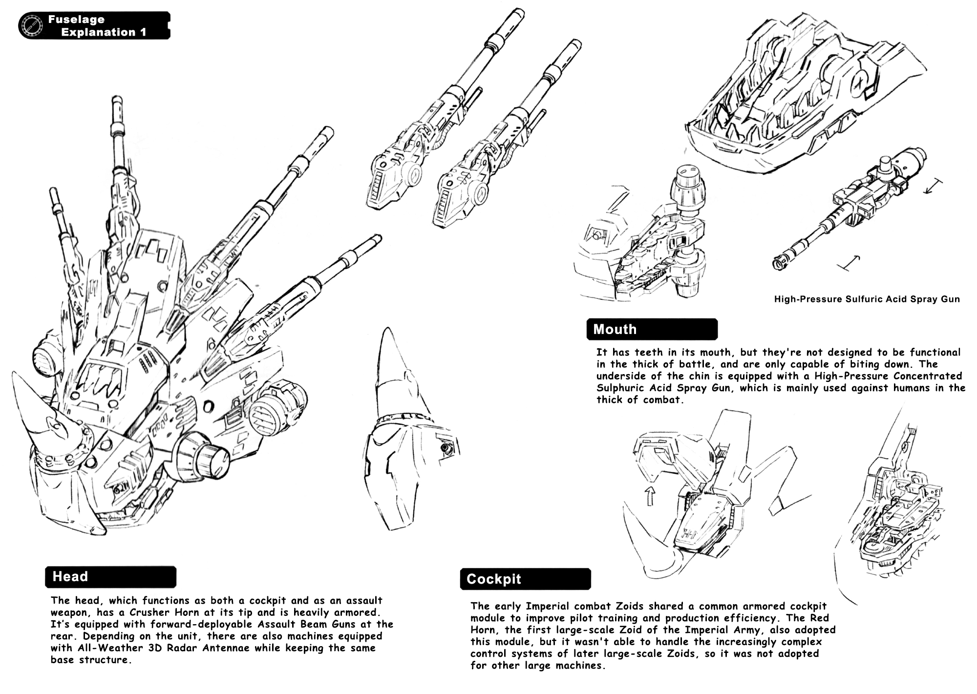It was the core Zoid of the Imperial Armored Division, and was called the "Moving Fortress" because of the heavy equipment and armor that was applied to the whole body.