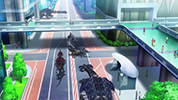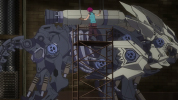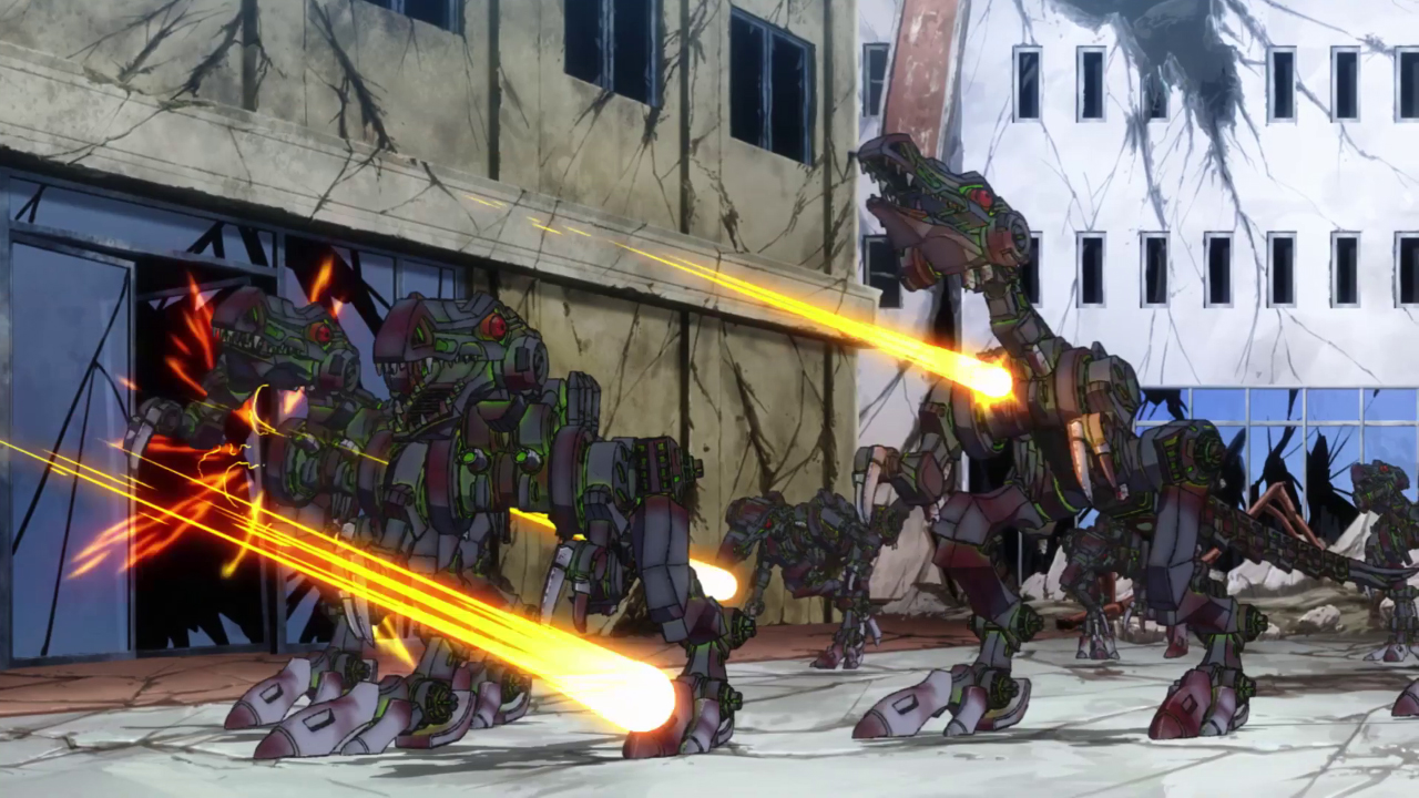 This ruin environment isn't just inhabited by the Empire, however. It seems skeletal Zoids, lacking in armor also roam the streets, exhibiting extreme aggression towards humans. This may very well be because of their tension with the Imperial army Zoids, but the animation for them is excellent. Even the raptor in the background seems to shy away, reluctant to attack as its allies get gunned down. We can certainly hope to see more of this in the show, with an animation style that seems to imply an overall budget increase for this second series. Furthermore, what is this green substance that seems to glow from inside the Zoids?