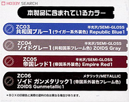 Mr. Color is releasing a set of Zoids paints based on common Republican and Imperial colors. These should very closely match the shades used for kits and provide excellent touch up ability for flash marks. Available for order on Hobby Search.