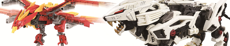 We continue to receive updates on the Anniversary Zero Phoenix. First on the list is a image showing off the flapping wings. Apparently, when connected to the Liger, the Phoenix's wings will flap up and down. Second, the kit will come with adaptors to attach the Zero armor from the AZ-02 Liger Zero. This includes a white canopy part so that you can recreate RD's Liger Zero from Zoids Fuzors, which had white around the ears instead of black. Last but not least, the separated Fire Phoenix (which, by the way, is looking much snazzier in color) will be able to flap its wings when pressing a button on the neck. This is interesting, as we've not had any mechanical non-motorized features in a while.