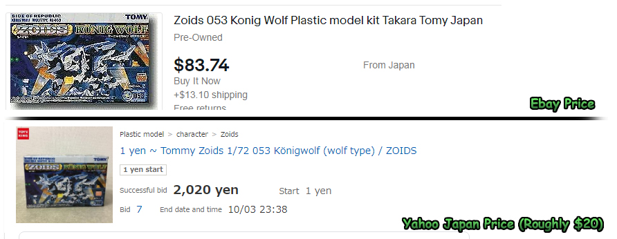 Note: Shipping fees are based on the Zoids weight, and may be higher depending on the seller's packaging. These prices were also calculated over 2 weeks ago, some may have changed since then. For example, when I made the images, the $140 (Sold) Konig Wolf was the most recent one.
