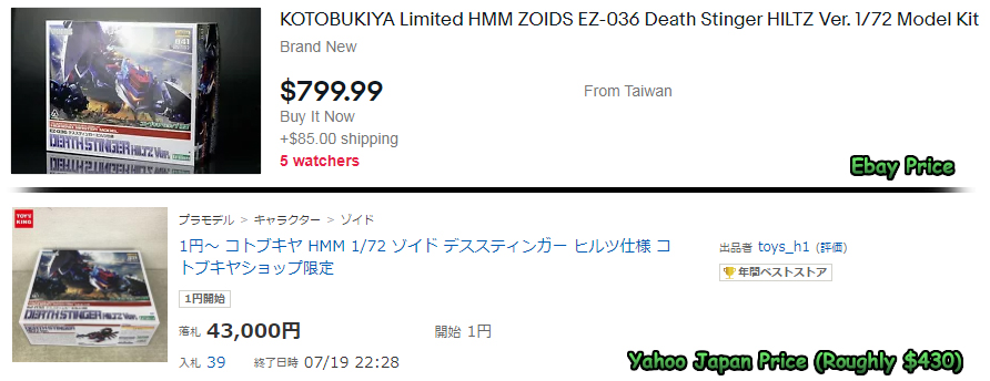 Lately there have been a lot of "hobby hunting" services popping up online, claiming that they can help you find any Zoid for a nominal fee. Now, this would be a fair service. The problem is, they're hiding their real fees behind heavily inflated prices. They take advantage of people unfamiliar with international markets. The buyer thinks they're finding super rare kits, and have no idea how common (or cheap!) they actually are.