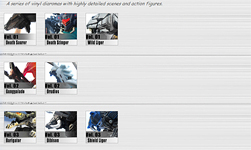 The Zoids Assorted Products section has been remodeled a little bit! It now includes thumbnails of some of the items you can expect to see in each area. I was originally going to do a thumbnail gallery like the Models and Action Figures but there are too many sections that will only have one or two items in them, so it really didn't look as good in the mock up. We'll be removing anything that doesn't actually have a page yet, except for things we expect to have done soon!