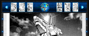 The reader launches into a different layout to maximize space. The header has a button in the center to return to the main site. Clicking the full size page will move you to the next, as well as being able to navigate a few pages at a time by using the thumbnails in the header. Clicking the fast forward buttons will take you to the next, or previous chapter start.